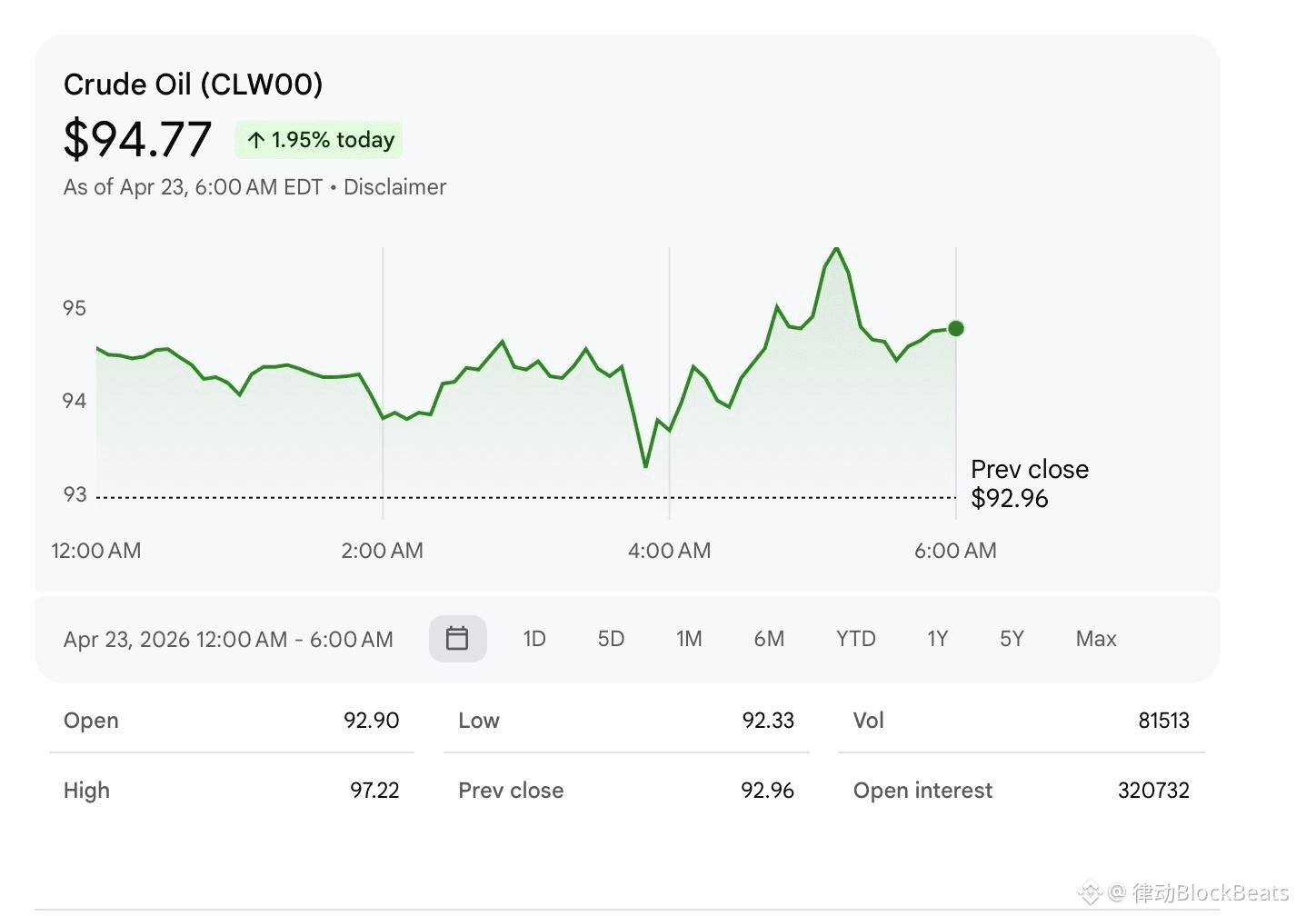 CENTCOM 4 月 23 日公布:封锁行动动用逾 1 万名美军士兵、17 艘军舰、100 余架飞机,已命令 31 艘船只(大多为油轮)调头或返港。布伦特原油价格在伊朗宣布拒绝重开海峡后单日涨超 4%,逼近每桶 100 美元。