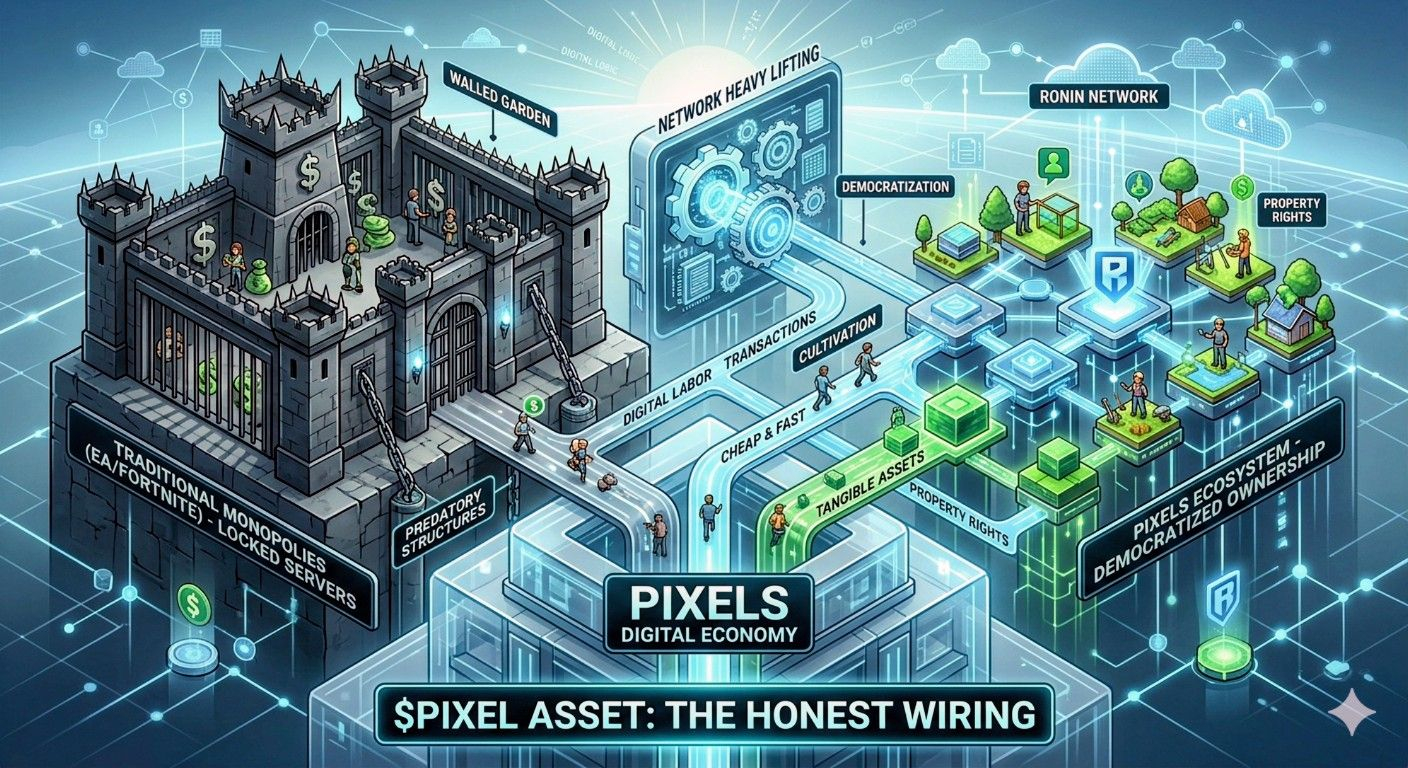 The $PIXEL asset does not act like a speculative lottery ticket but rather the actual wiring of the virtual world itself.