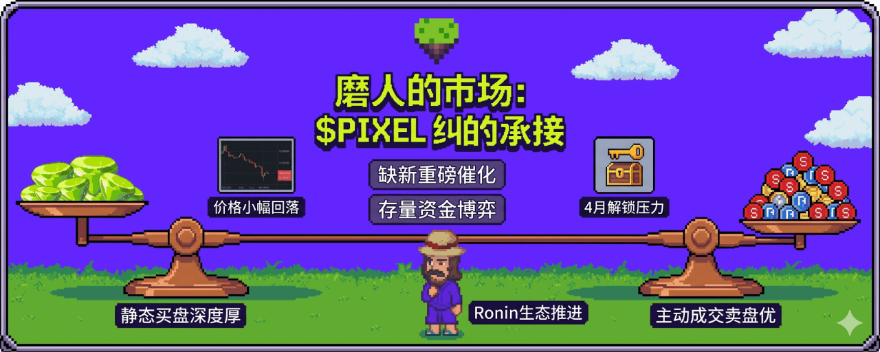 This kind of market is actually very typical and most likely to drain emotions. It won't shatter expectations like a sudden drop, nor will it boost confidence like a strong surge; it's more like a fatigue from the tug-of-war between existing funds. Some are willing to hold, while others choose to sell, and the price slowly grinds in this not-so-strong competition. Applying this to the current $PIXEL , this feeling is especially pronounced. The discussions around it haven't changed much; they still circle around those two old questions: one is how much of the pressure from the April unlock has been digested, and the other is whether the steady progress in the Ronin ecosystem can gradually convert into more convincing long-term expectations.