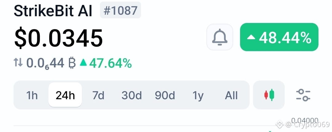 StrikeBit AI is up 55.79% to $0.0349 in 24h, dramatically outperforming a flat broader market, primarily driven by a high-volume breakout with no clear coin-specific news catalyst.