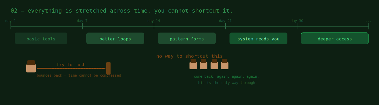 everything is stretched across time. upgrades take time, routines take time, even understanding the system takes time. there’s no real way to shortcut that. you can’t rush your way into the deeper layers just by grinding harder or playing longer in one sitting.