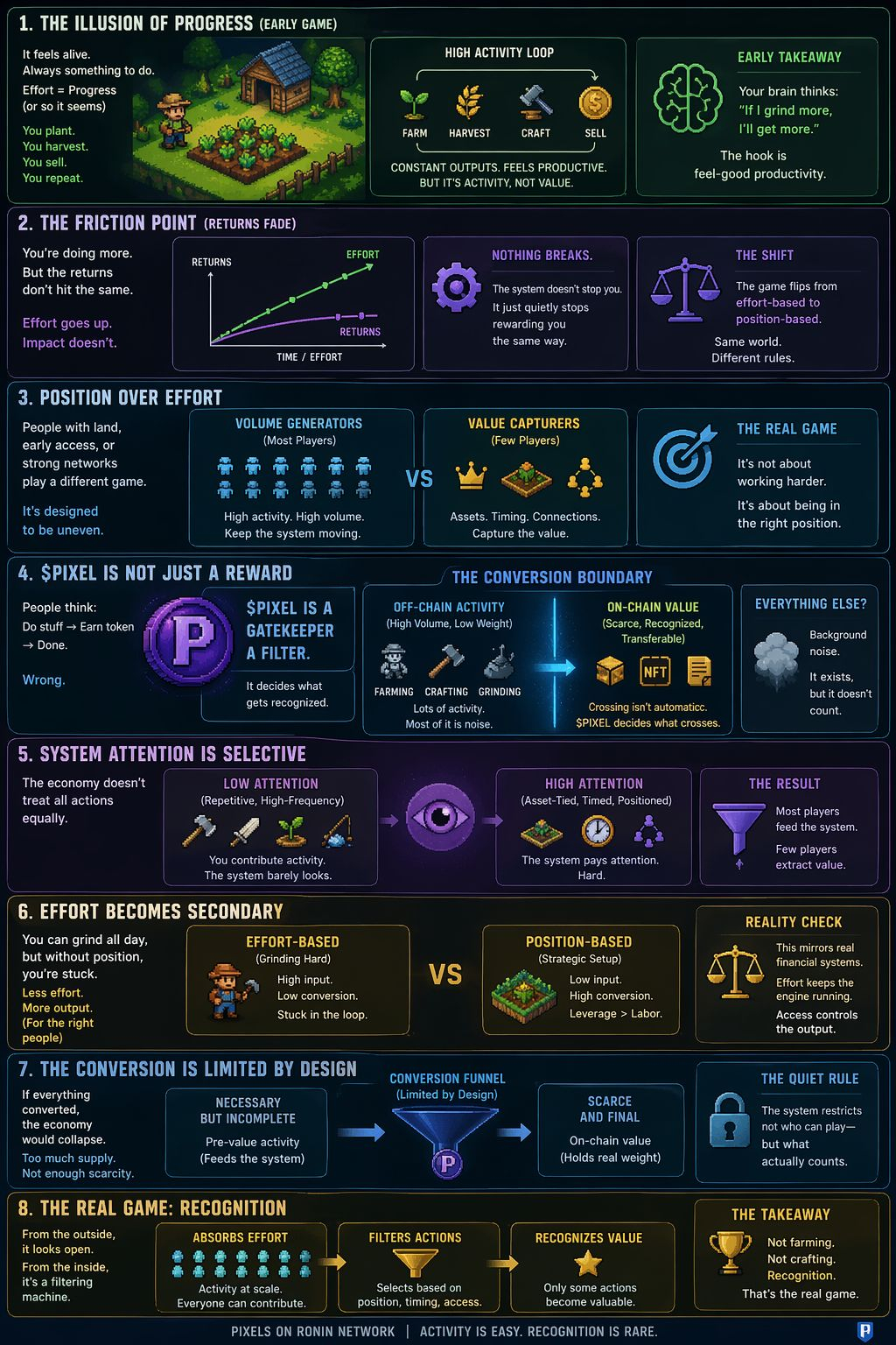 Most of what happens in Pixels lives on the “pre-value” side. It’s necessary, but it’s incomplete. It doesn’t carry weight until it crosses into that finalized state through tokenization, trade, or blockchain interaction.