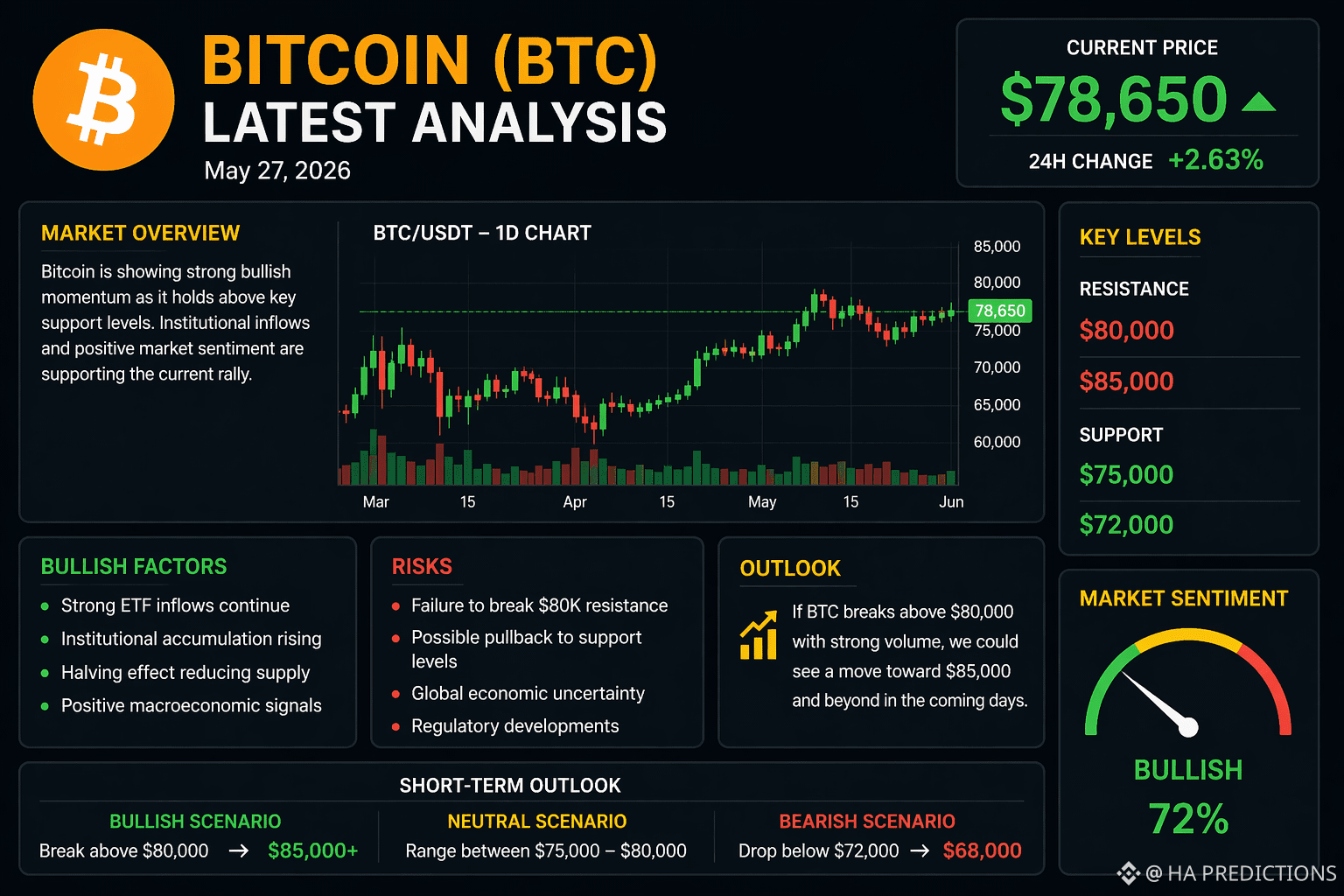 $BTC iss waqt $75K–$80K range mein trade kar raha hai aur market mein strong bullish momentum dekhne ko mil raha hai. Agar price $80,000 resistance ko break karta hai, to next target $85,000+ ho sakta hai. Lekin agar rejection milti hai, to price $72K–$75K support zone tak wapas aa sakta hai. Overall, BTC abhi uptrend phase mein hai, lekin next move ke liye resistance breakout bohat important hai#AaveAnnouncesDeFiUnitedReliefFund #BinanceLaunchesGoldvs.BTCTradingCompetition #KelpDAOExploitFreeze #KelpDAOExploitFreeze