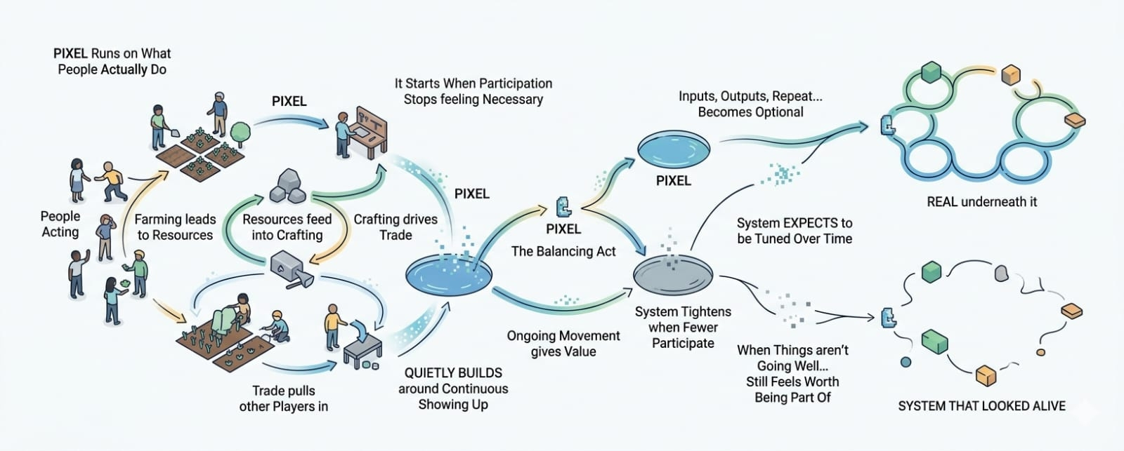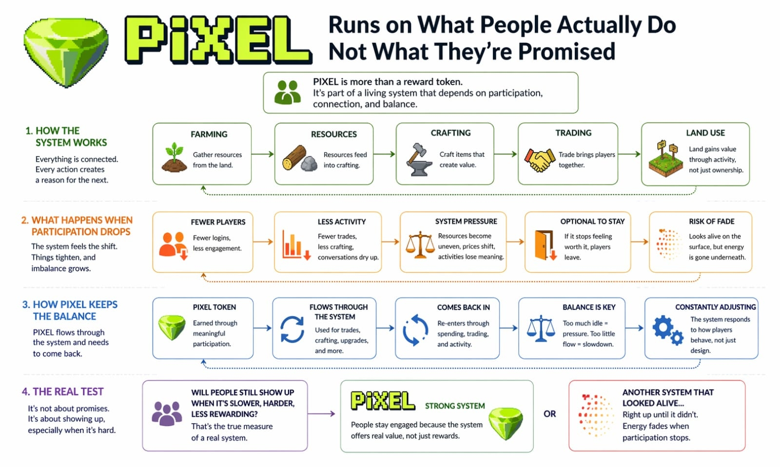 ItPIXEL Runs on What People Actually Do Not What They’re Promised sounds simple when you say it out loud. But in practice, it’s fragile.Because the moment fewer people participate, you can feel it. Resources become uneven. Prices shift. Certain activities stop making sense. The system tightens in ways that aren’t always comfortable. I’ve seen that happen before, and it’s usually where things start to break.But maybe that’s not entirely a flaw.It actually feels closer to how real systems behave. When participation drops, things adjust. Not always smoothly, but honestly. The difference is that in games, people don’t have to stay. If it stops feeling worth it, they just leave.That’s where PIXEL sits in all of this.It’s not just a reward it’s part of the balancing act. It flows through the system based on what people do, but it also needs to come back into it. If too much of it sits idle, pressure builds. If too little moves, activity slows. Keeping that balance isn’t something you solve once it’s something you keep adjusting.@Pixels And to its credit, Pixels doesn’t really hide that.It doesn’t pretend to be perfectly stable. If anything, it feels like a system that expects to be tuned over time responding to how players behave, not just how it was designed on paper. That makes it harder to judge quickly, but maybe more honest in the long run.