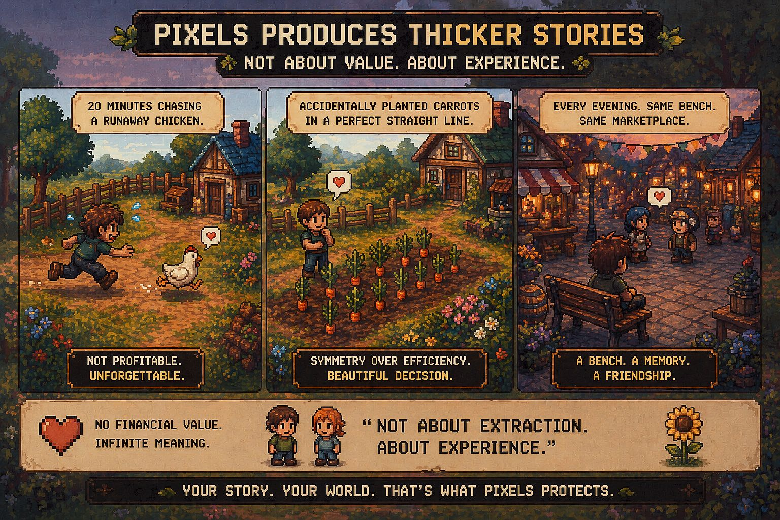 Pixels produces thicker stories. They sound different. There is the player who spent twenty minutes chasing a runaway chicken. The one who accidentally planted carrots in a perfect straight line and then decided to leave them because the symmetRy looked nice. The one who logs in every evening just to siT on a specific bench near the marketplace because that is where they first met someone who became a friend. Those stories have no financial value. And that is exactly why they matter. They are not about extraction. They are about experience.
