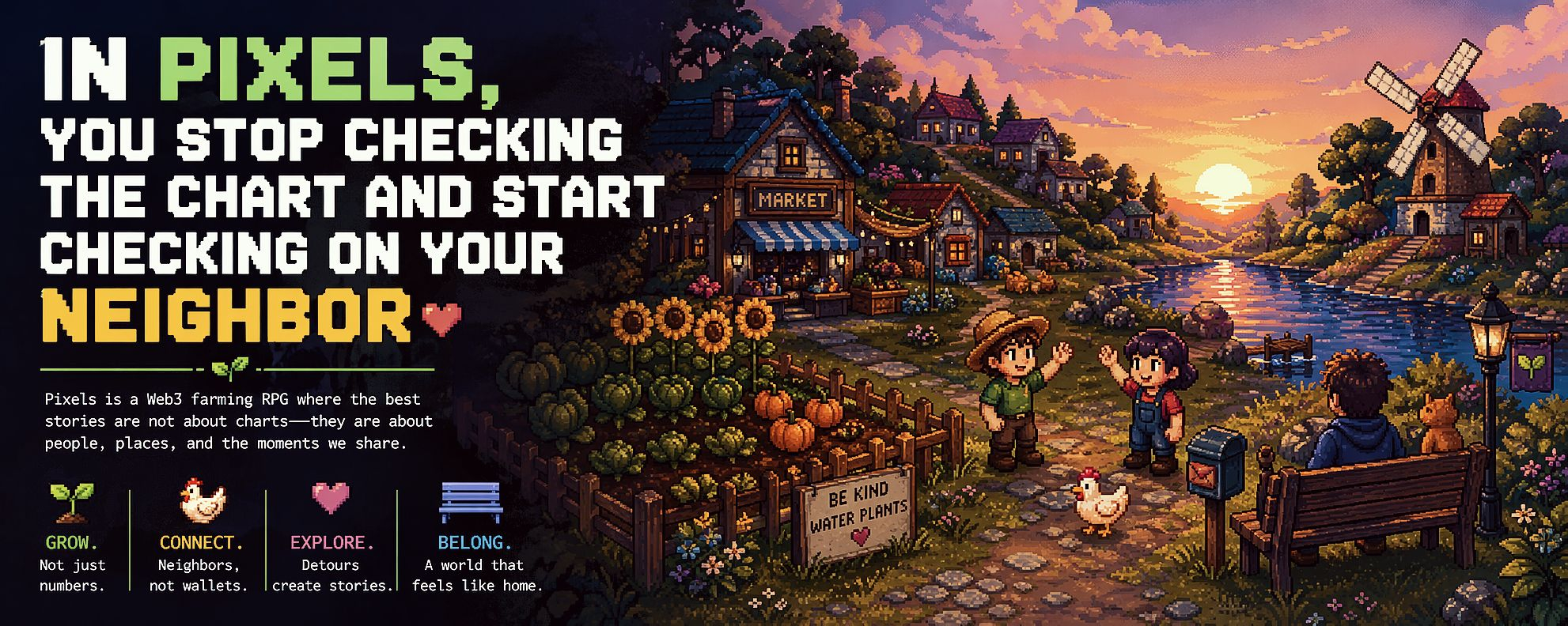 The game feeds these stories through its design. Progression in Pixels is slow. Crops take real hours. Animals need daily attention. You cannot rush everything. That slowness creates gaps, and gaps leave room for the unexpected. You wander while waiting for your pumpkins to grow. You notice a neighbor's gate is left open. You walk in, see their farm, maybe leave a little note. None Of that was scripted. The game did not give you a quest to explore. It just left the door open and trusted your curiosity. That is how player stories start. Not with a reward. With an invitation.
