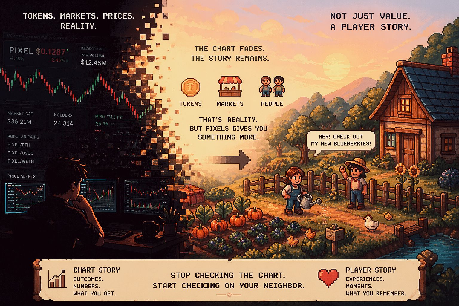Maybe that is the real difference. Chart stories are about outcomes. Player stories are about presence. A chart tells you where you ended up. A player story tells you what it felt like to be there. Pixels chooses presence. It says, do not worry about the prIce of your pumpkins right now. Just water them. Look at how the light hits the leaves. Over there, someone is waving at you. Go see what they want. The tokens will still be there later. But the moment when you fIrst helped a neighbor harvest their field, when you found that hidden pond, when you sat on that bench and watched the sun set over a world you helped build? That moment is yours. No chart can grab it. And no chart can take it away.