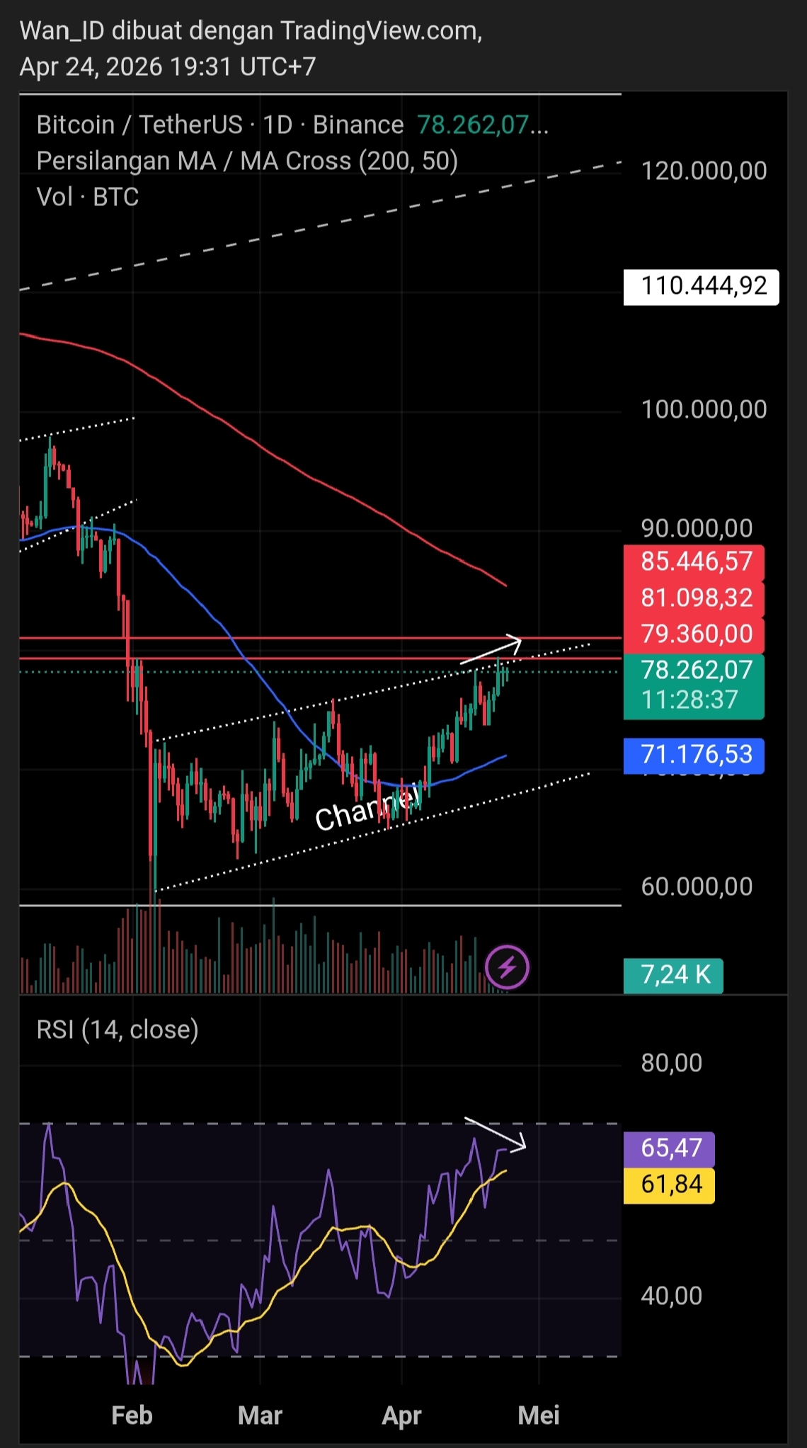 The price is moving steadily bullish in the short term, but there are risks that need to be considered, there is a Bearish Divergence on the chart which indicates weakening buyer volume but the price is still blocked by key resistance, the crucial point is at $79,360 - $81,098, If the price can break through the key resistance with convincing volume and is able to claim the resistance as support, the price can recover further and even become a reversal.