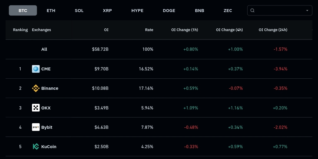 It's shows the total Bitcoin Open Interest (OI), which reached $58.72B. CME leads institutionally with $9.70B, followed by Binance in the retail market with $10.08B. The data shows an overall OI decrease of -1.57% in 24 hours, although there is a slight increase in the last 1-hour and 4-hour timeframes.