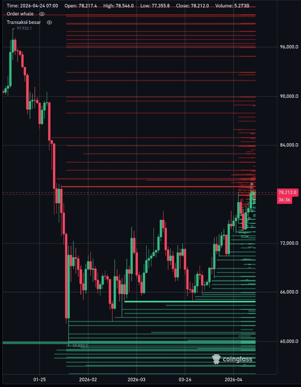 This image displays the order book and liquidation area. The current price is around $78,212. A very strong red wall (resistance) is visible from the $80,000 to $96,000 level. On the downside, there is a fairly dense green liquidity cushion (support) in the $60,000-$66,000 area.