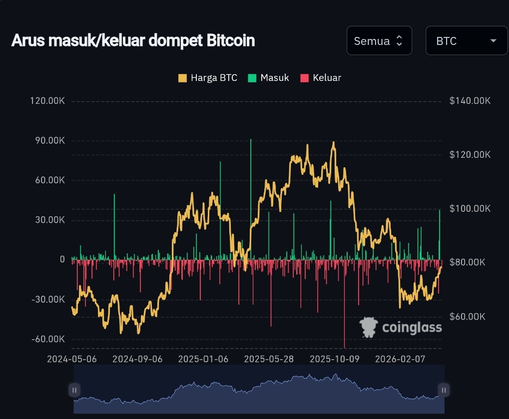 The inflows (green) and outflows (red) from exchanges. As seen at the end of the chart (April 2026), there is a significant spike in green bars entering exchanges, accompanied by increasing price fluctuations.