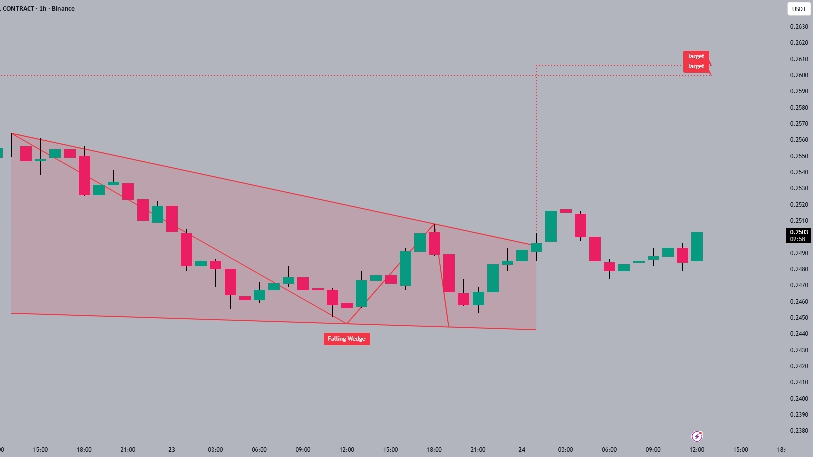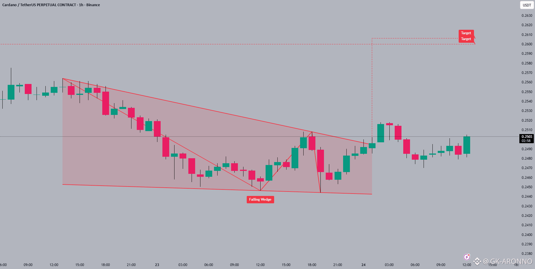 #ADA has successfully broken out of a falling wedge pattern 🚀, currently consolidating above the upper trendline. Traders are now looking for a push toward the identified target levels around 0.2600. Patience is key as bullish patterns often lead to significant upward momentum after a breakout 📈.
