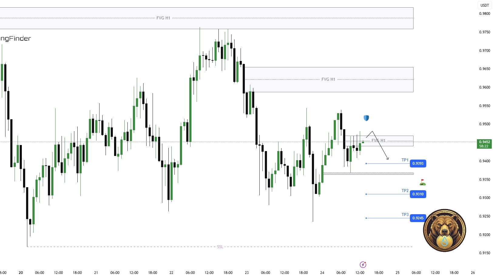 Rejection from premium FVG increases probability of downside continuation toward 0.9369 to 0.9245.