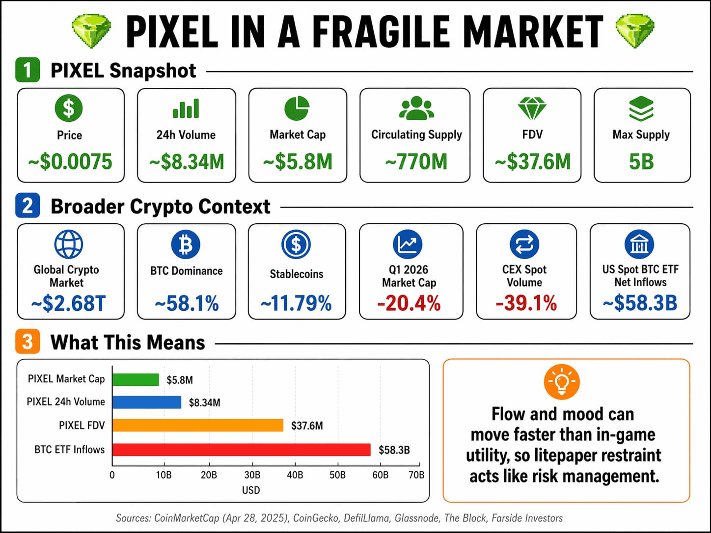 The market context makes that restraint look more intentional, not less. Today PIXEL trades around $0.0075, with roughly $8.34 million in 24 hour volume against a market cap of about $5.8 million. That means daily turnover is larger than the token’s equity like value, which is another way of saying flow and mood can dominate price faster than slow utility can stabilize it. Circulating supply sits around 770 million tokens, while the fully diluted valuation is about $37.6 million on a 5 billion max supply. So even before we talk design, we are looking at a small asset that can be pushed around by narrative, exchange activity, and unlock expectations more easily than by patient in game demand.