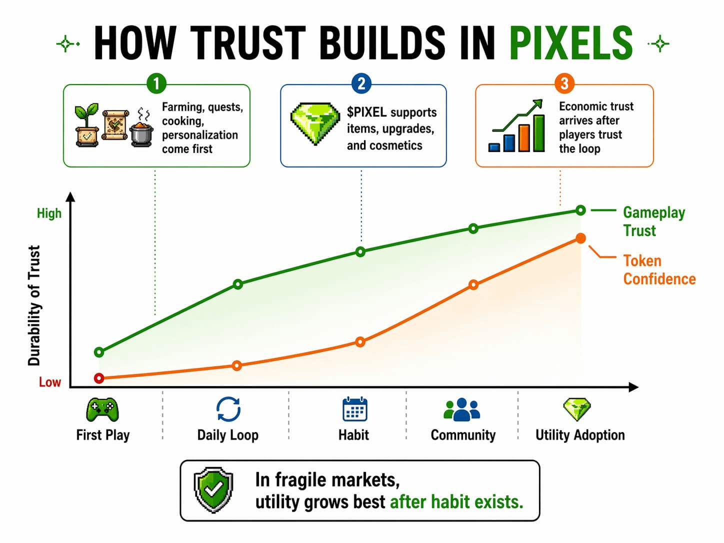 That is why the token language matters so much. The docs say $PIXEL is a premium in game currency for items, upgrades, and cosmetic enhancements outside the core gameplay loop, and that players do not need it to progress. A lot of people hear that and think the token is being diminished. I read it differently. Surface level, the token is present. Structurally, it is being kept from becoming a tax on basic play. In practice, that gives the game room to build habit without making every ordinary action feel priced. The tradeoff is obvious too. A token kept in a supporting role can look less exciting to speculators who want immediate centrality.