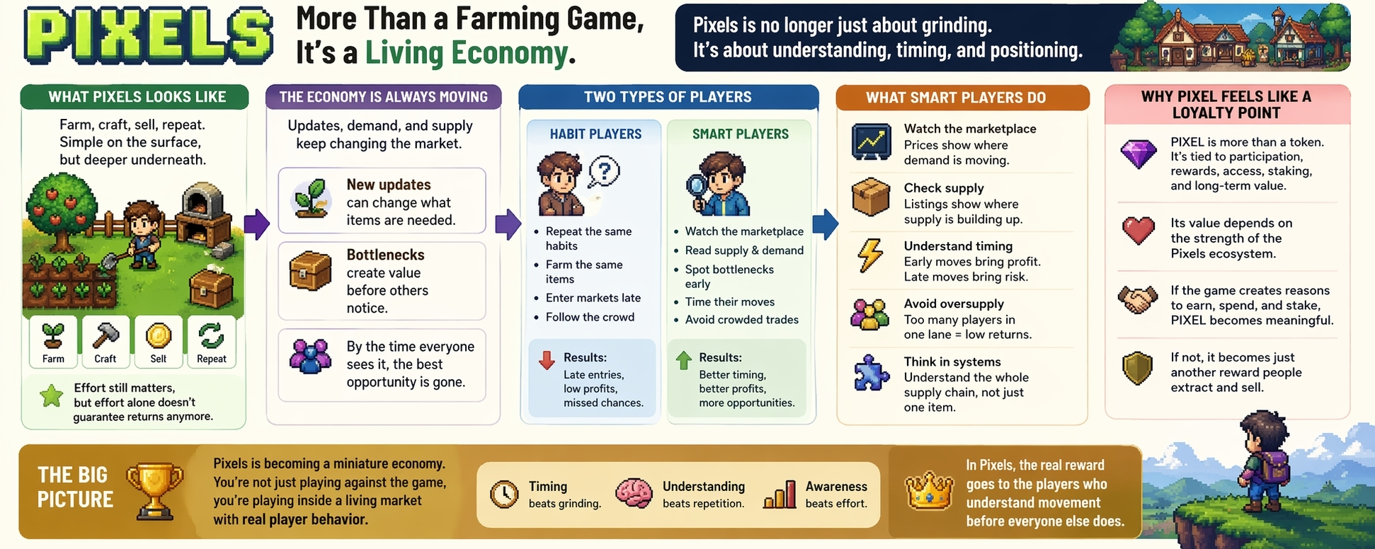 But the more I watch the project, the more I feel like Pixels is slowly training players to think differently. It is not only about who spends the most hours grinding anymore. It is about who understands what is happening inside the economy before everyone else catches on.