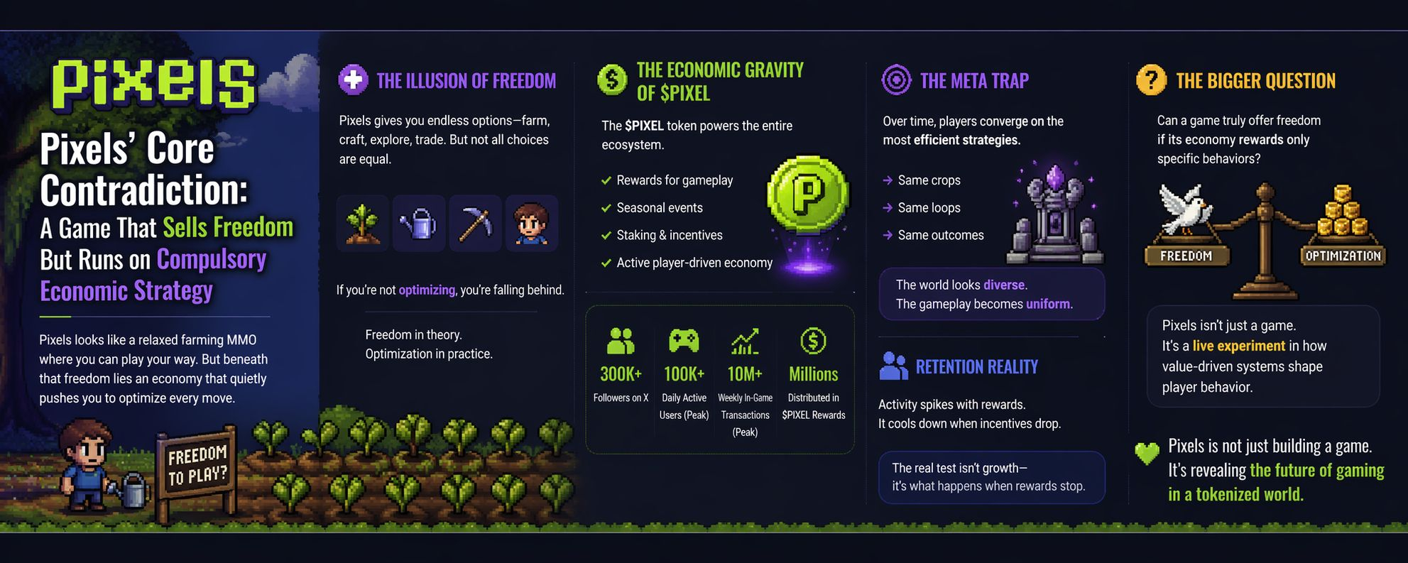 Like most systems with measurable outcomes, Pixels develops a “meta”—a set of strategies that maximize efficiency. And once that meta becomes clear, players naturally converge toward it. Certain crops become standard. Certain gameplay loops become dominant. Certain paths become “correct.”