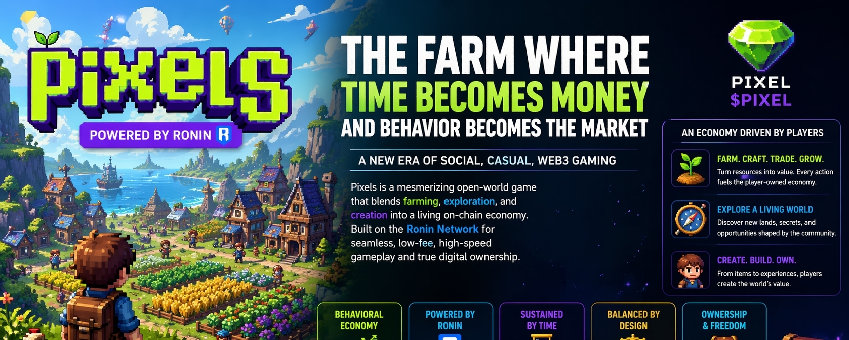 Pixels (PIXEL) doesn’t behave like a game in the way most people still try to frame it. i don’t see crops, land, or avatars first — i see a live economic surface where attention, time, and coordination are constantly being priced. what looks like casual farming is actually a low-friction labor market embedded inside a blockchain environment, where every click quietly feeds into a system that resembles a soft version of on-chain productivity.