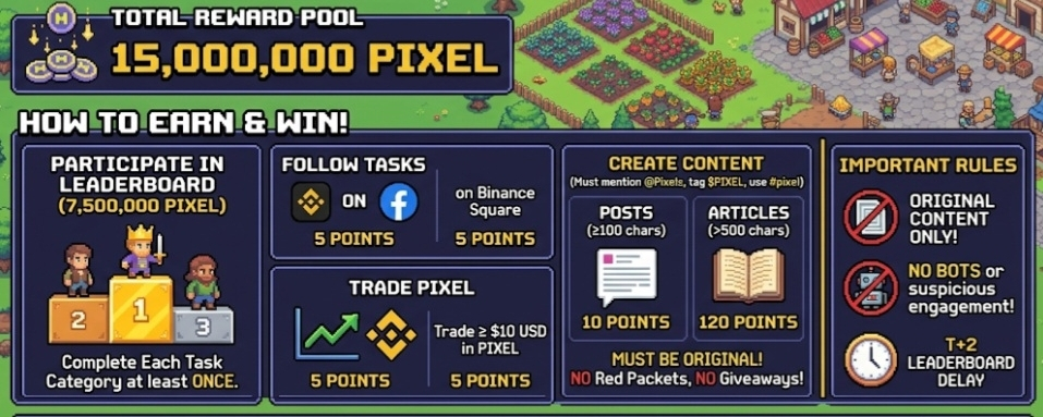 To qualify for a share of the 7,500,000 PIXEL leaderboard prize, you must complete each task category at least once. Points are accumulated by following official accounts on Binance Square and social media, trading at least $10 USD in PIXEL, and generating original content. When crafting posts (100+ characters) or articles (500+ characters), you must mention @Pixels, tag $PIXEL, and include the #pixel hashtag.