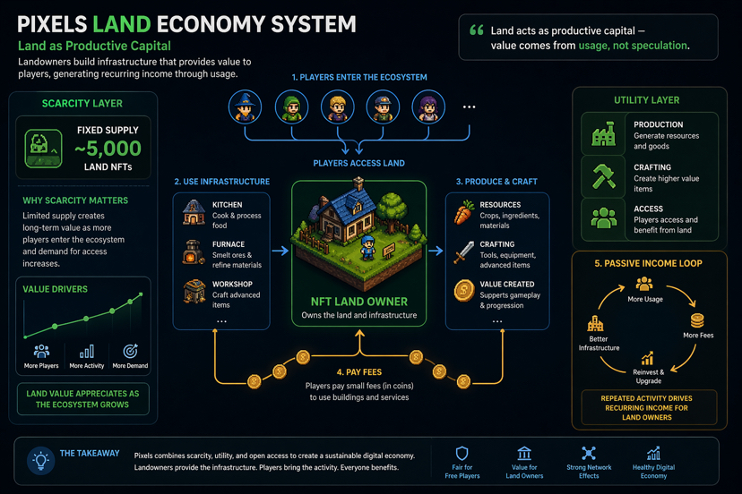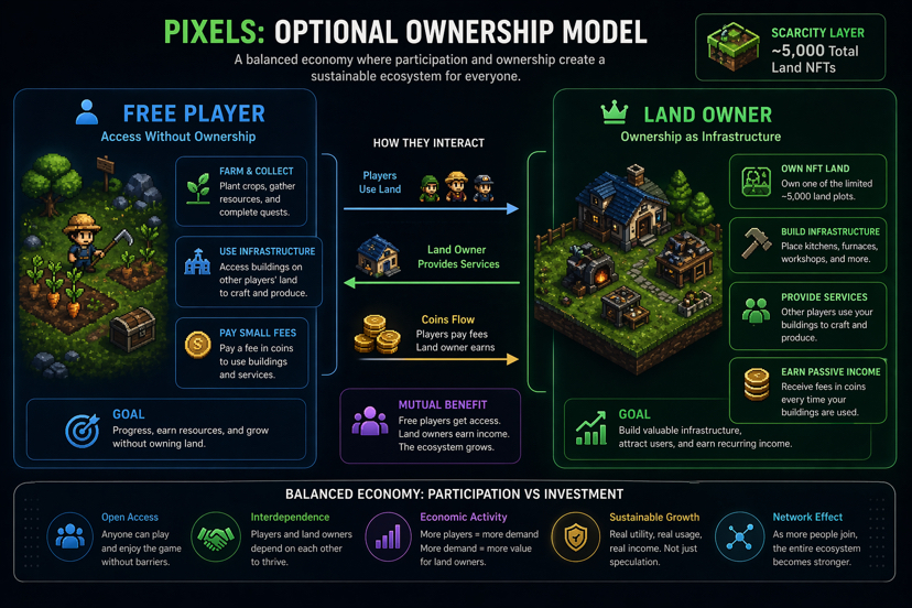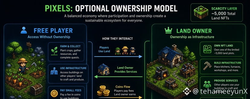 Here’s the thing. Land in Pixels is optional, which sounds like a small design choice, but it actually changes everything. You don’t need to own anything to play. You can show up, grind, progress, enjoy the game just fine. But at the same time, there’s this parallel layer running underneath one where ownership starts to matter in a very real way.