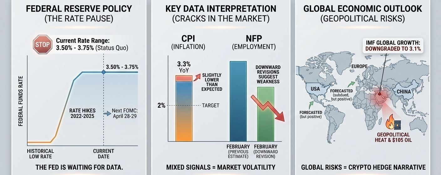 The global economy is currently standing at a massive crossroads. With the IMF revising growth forecasts and the Federal Reserve playing a high-stakes game of "Wait and See," the volatility we’re seeing in BTC and ETH isn't just "crypto being crypto"—it’s a direct reflection of a shifting macro landscape.