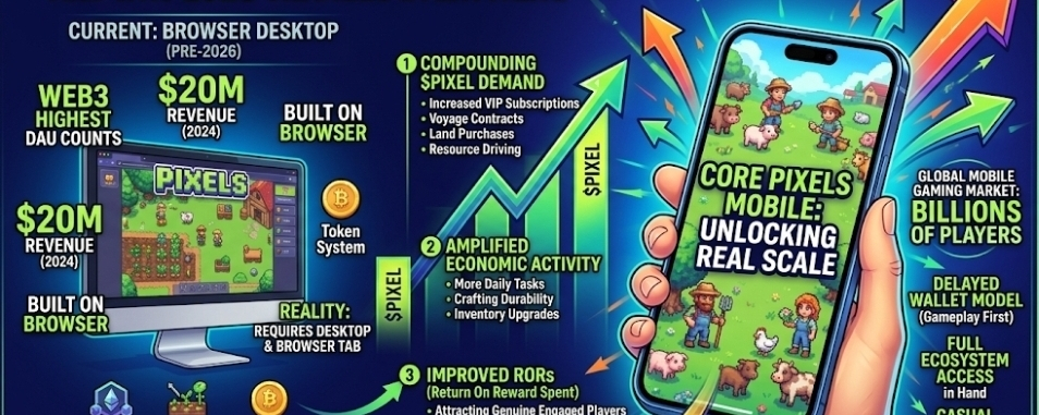 honestly i think core pixels mobile is the single most underpriced catalyst in the entire pixels roadmap right now. everything that's been built — the staking system, the smart-reward infrastructure, the data loop, the $vPIXEL mechanics, the RORS framework — was built to scale. and it hasn't been tested at real scale yet. mobile is what real scale looks like. the question isn't whether a mobile version of core pixels will bring more players. the question is — when billions of mobile devices become potential entry points into the pixels ecosystem, does the infrastructure pixels has spent years building finally get the audience it was always designed for? 🔥