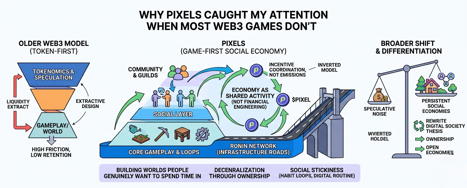 What caught my attention wasn’t the farming mechanics themselves. It was realizing Pixels isn’t really trying to be a flashy “play-to-earn” revival. I think it’s quietly testing something much more important — whether Web3 games can feel like actual games first, and economies second.