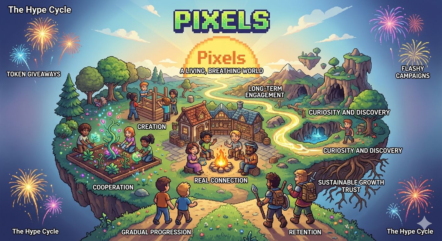 In the fast paced world of Web3 most projects begin with loud announcements, token giveaways and communities built on fleeting attentions. Everyone chases the next big reward, hoping momentum will carry them forward. But Pixels chose a different path one that values experience over hype.