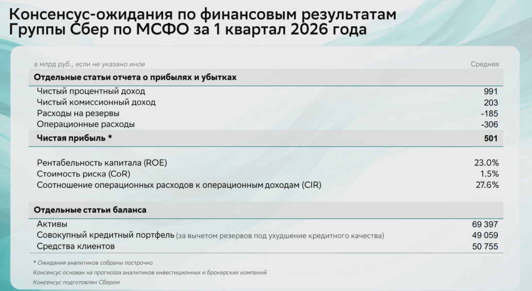Аналитики ожидают, что чистая прибыль Сбербанка (SBER) по итогам первого квартала 2026 года по МСФО составит, согласно средней оценке, рекордные ₽501 млрд. Это следует из опроса 17 аналитиков инвестиционных и брокерских компаний, который провел банк. Результаты опроса приводятся в рассылке Investor Relations «Сбера», которая есть в распоряжении «РБК Инвестиций». Финансовые результаты группы по МСФО за первый квартал 2026 года будут опубликованы 29 апреля.
