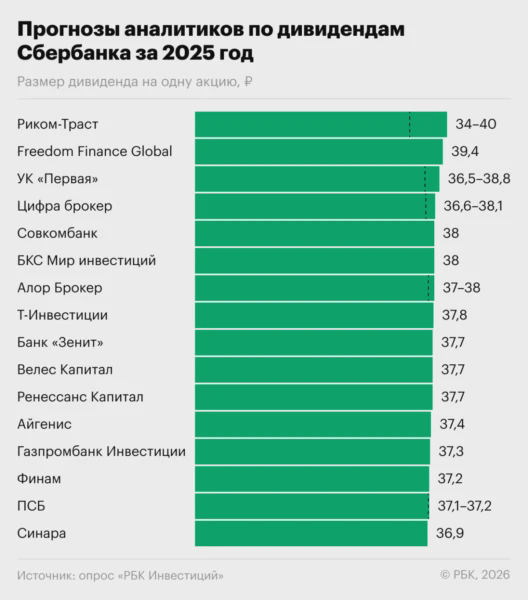 В начале января «РБК Инвестиции» собрали прогнозы аналитиков по дивидендам Сбербанка за 2025 год. Оценки были в диапазоне ₽34–40 на акцию.