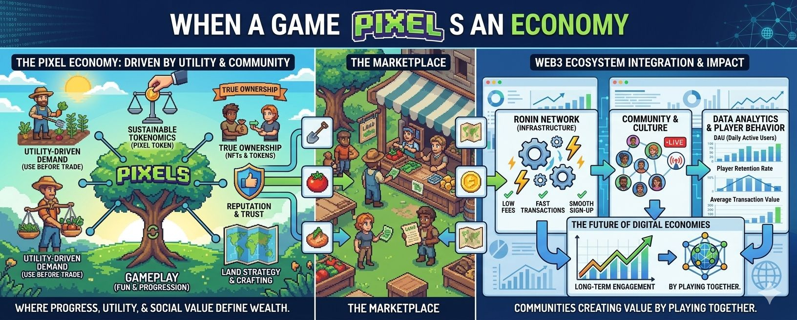 At first Pixels looks like a farming game with blocky graphics. Players grow crops, collect resources, complete quests and explore a world.. Under the simple look there is a deeper social economy.