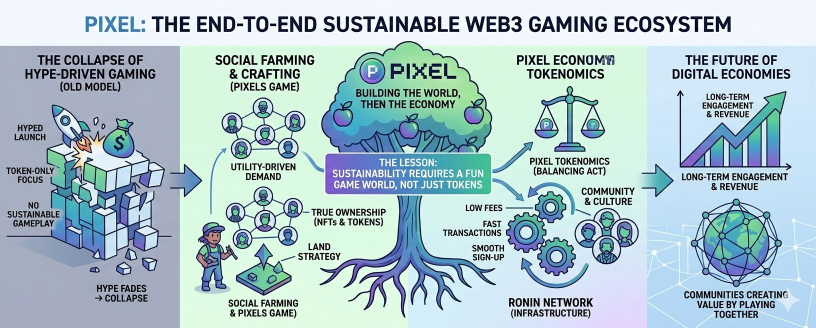 That is why PIXEL is important. It shows a mature way of doing Web3 gaming. This way the gameplay, keeping players, community and economics that work in the term are just as important as the tokens. PIXEL is built around a game called Pixels, which's a social farming game that uses the Ronin Network. The project focuses on what games should focus on: being fun letting players progress and having meaningful interactions.