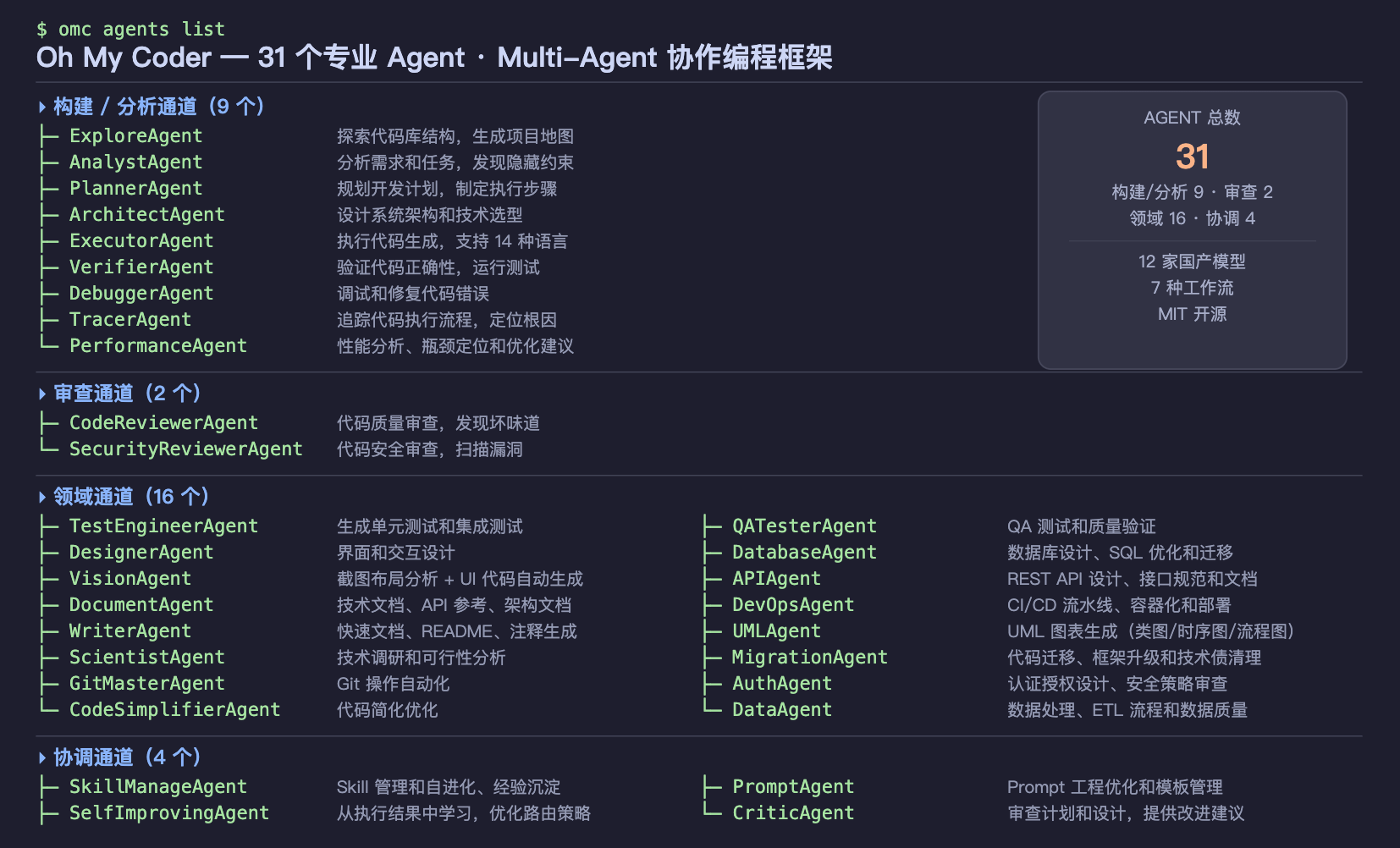 Every time you issue a task, oh-my-coder won't send all 31 Agents out. It will automatically select the most suitable combination of Agents based on the task type, for example: