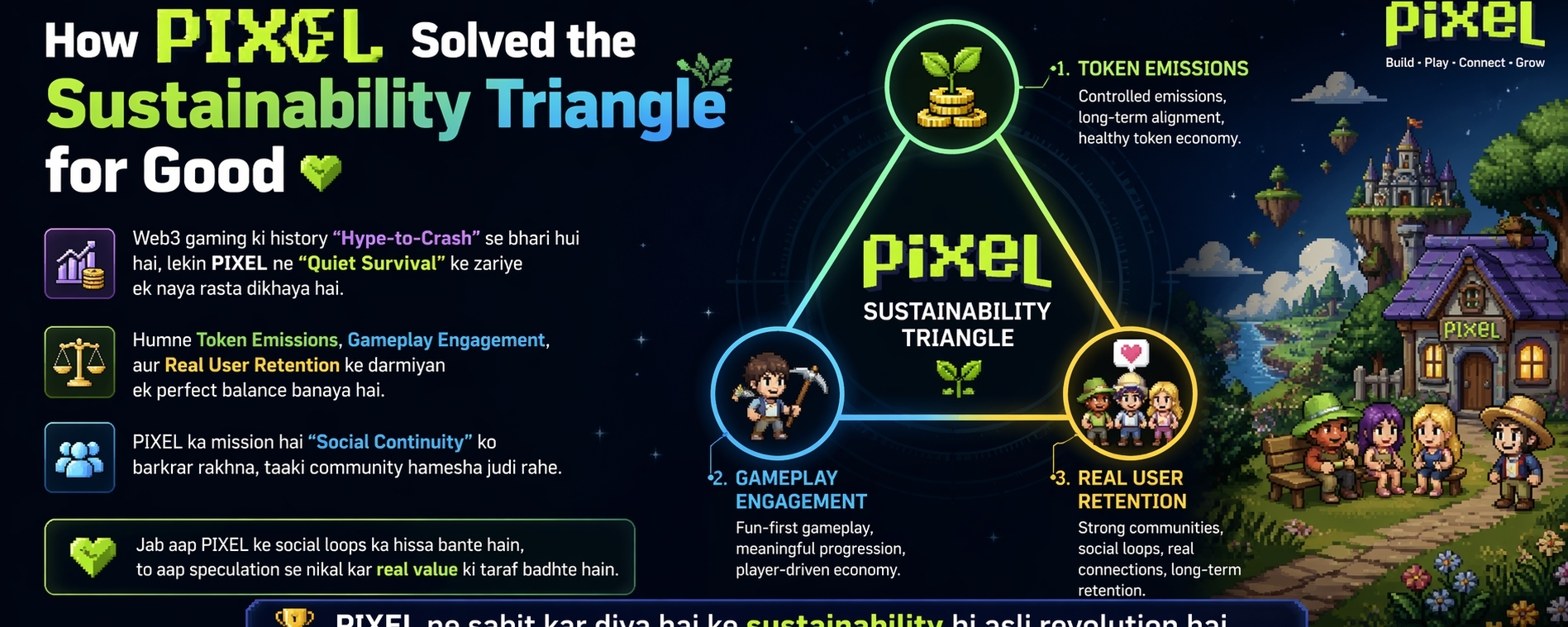 At the core of PIXELs success lies a simple yet powerful idea: balance. Instead of focusing on a single aspect like token price or rapid user growth PIXEL has carefully designed an ecosystem that aligns three essential pillars token emissions gameplay engagement and real user retention. These three components work together to create a stable and self sustaining environment.