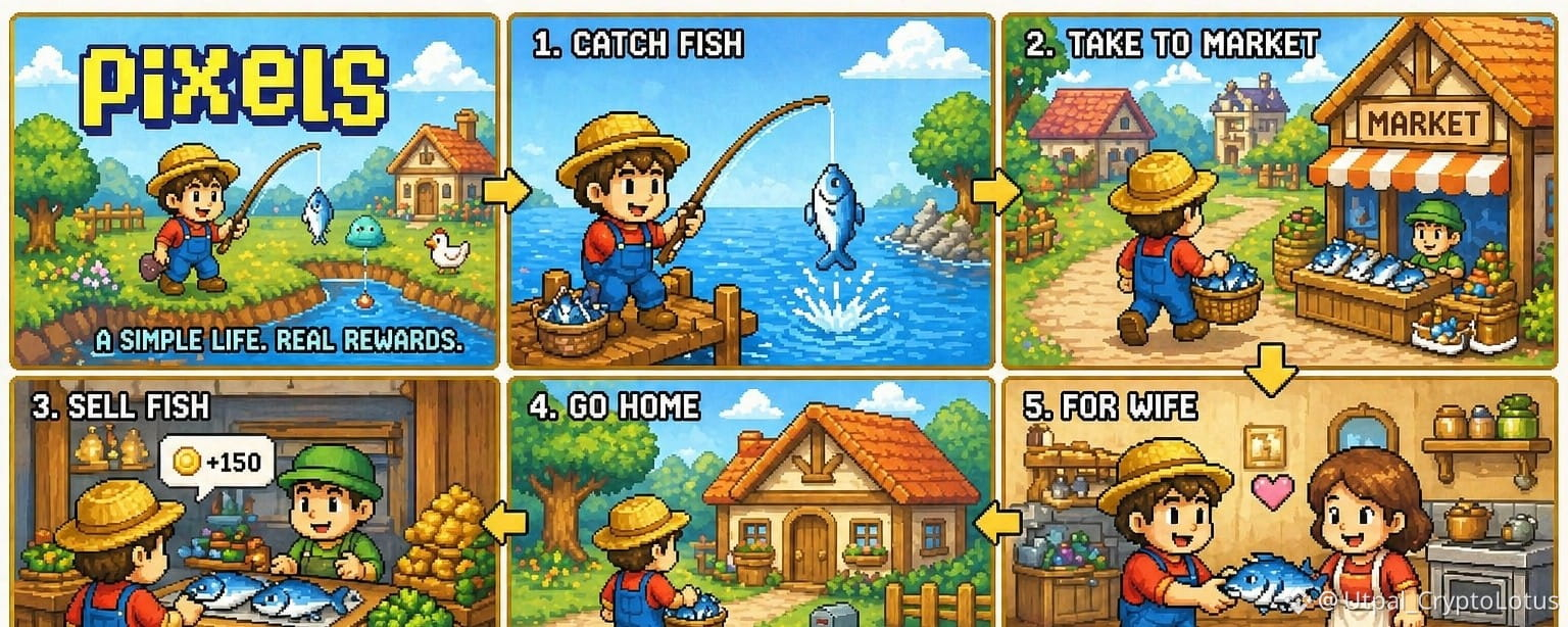 In conclusion, Pixels is more than just a game. It is a living ecosystem where players can explore, earn, and grow. The image beautifully captures this journey in a simple and relatable way. From catching fish to living a happy life, every step reflects a deeper meaning. For me, this project is not just about gaming—it’s about understanding the future of digital interaction and economic systems.