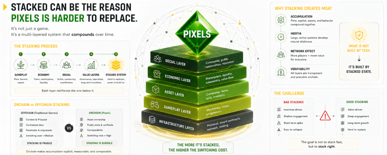 I think the easiest way to frame this is through the idea of “stacking.” Not stacking in the technical sense, but stacking as accumulated behavior, habits, capital, relationships, and shared history. In crypto, what becomes hardest to replace usually isn’t the product alone, but the system of things that have been built around it. Looking at Pixels this way shifts the conversation from “it’s just a farming game” to “it’s a system that keeps compounding across multiple layers.”