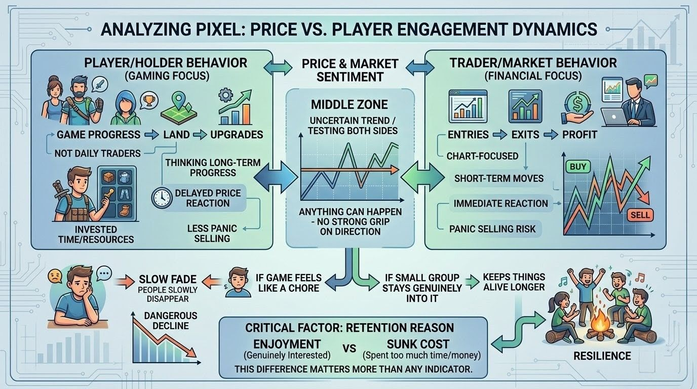 What makes PIXEL tricky is the people holding it. Some are traders sure. But a lot of them are just playing. They’re not thinking about entries and exits every minute. They’re thinking about progress upgrades land whatever keeps them moving forward in the game.