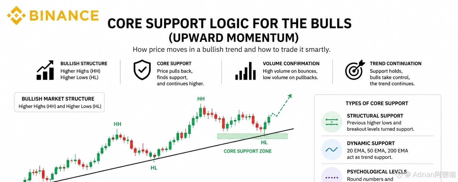 In a bullish market, price doesn’t just go up in a straight line—it pulls back, finds support, and then continues higher. Understanding this “core support logic” is what separates disciplined traders from those who chase price.