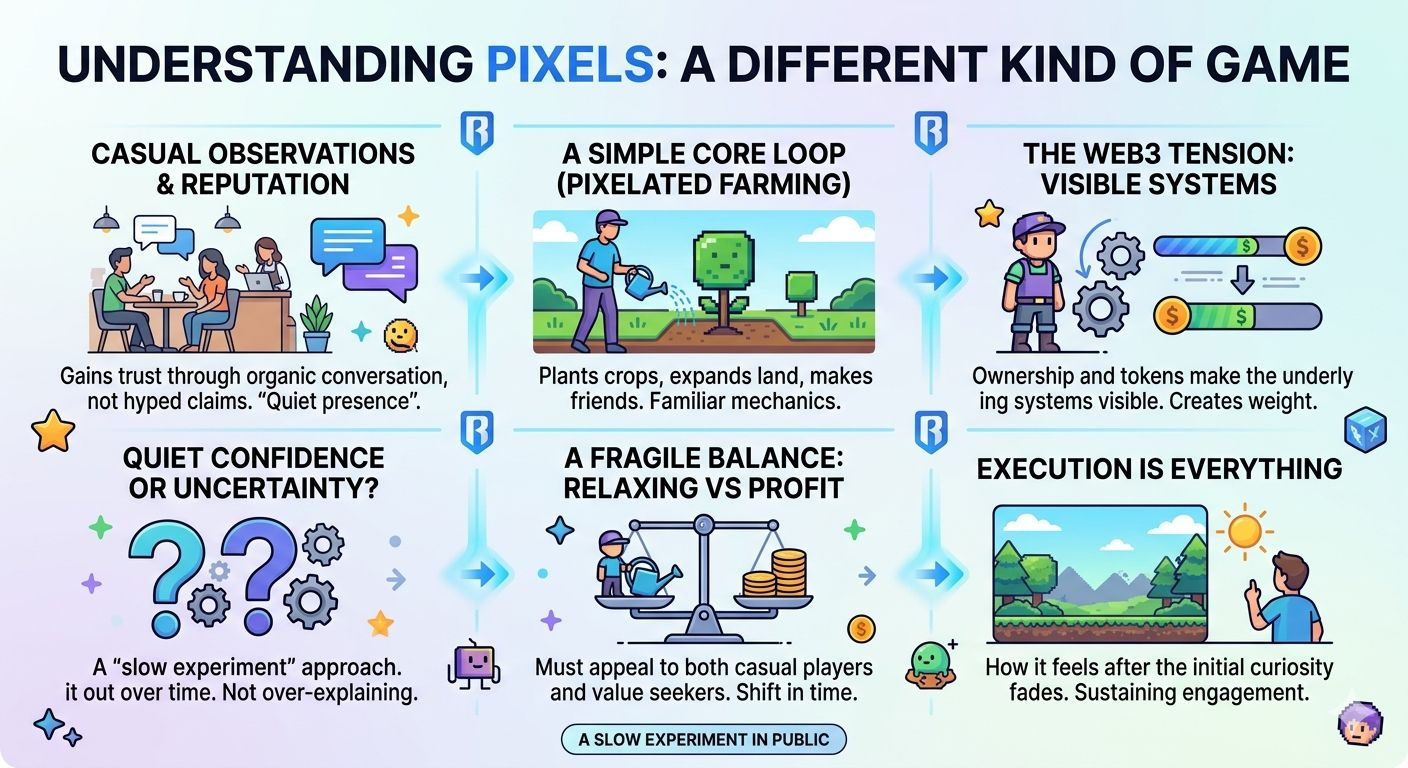 What I notice about Pixels is that it’s not trying too hard to explain itself. That can be a strength, but it can also hide uncertainty. I’m not fully convinced yet whether this quiet approach means confidence or just careful positioning. Maybe the team understands that over-explaining kills immersion. Or maybe they’re still figuring things out in real time. Either way, it doesn’t feel like a finished story.