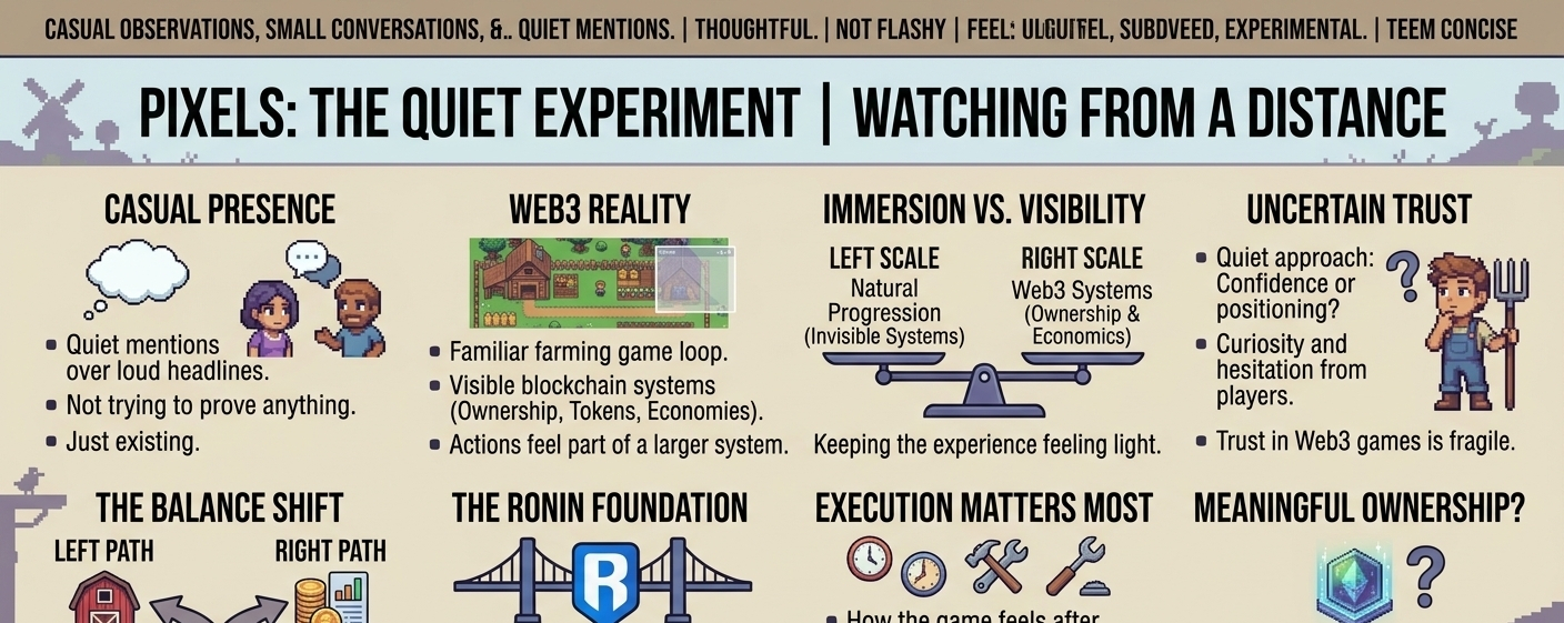 I keep seeing Pixels pop up in places where people aren’t trying to impress anyone. Just casual mentions, quiet observations, small conversations that don’t feel staged. That alone makes me pause a bit. In a space where most projects are constantly trying to prove something, this one feels like it’s just… existing. I’m watching it from a distance, trying to understand what it actually becomes when you ignore the usual Web3 noise.
