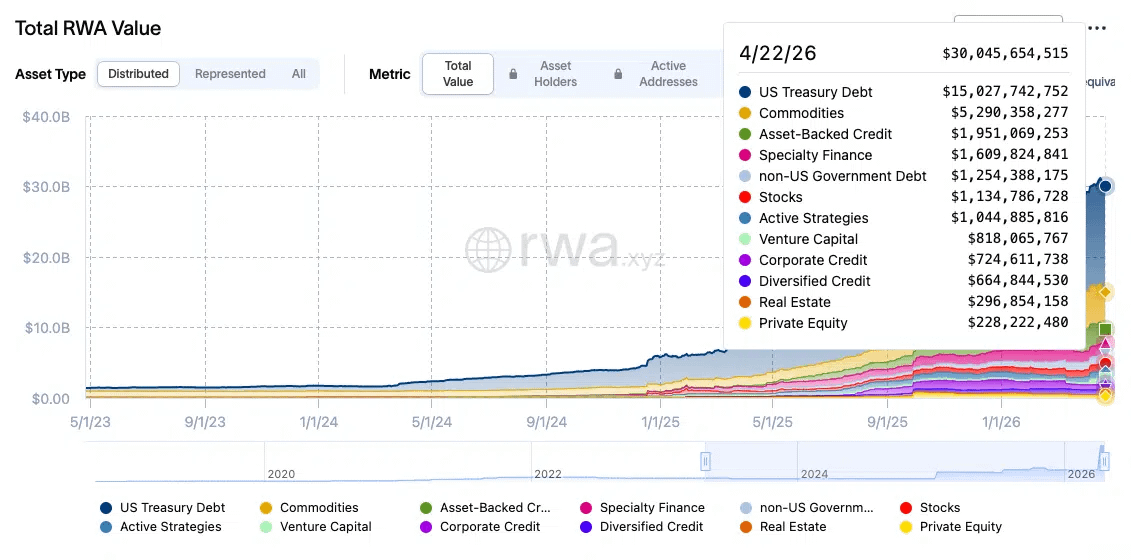 According to market data, the value of tokenized RWAs has grown from approximately $1.5 billion around the beginning of 2023 to over $30 billion as of April 2026. This increase is driven by a steady influx of capital into RWA tokens and the development of infrastructure associated with these instruments.
