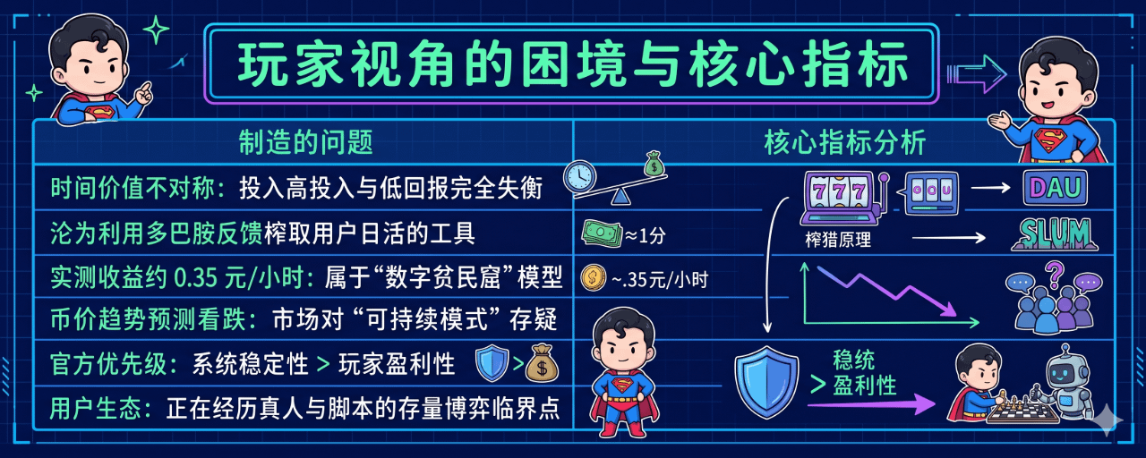 But I think if a game's token can only maintain value through 'pyramid schemes', then its ceiling is pretty limited. Currently, the $PIXEL RORS metric has stabilized the system, preventing it from crashing like before, but this stability comes at the expense of player earnings. The current metric value/performance analysis shows actual earnings of about 0.35 yuan/hour, which is below the survival standard in most regions, falling into the 'digital slum' model.