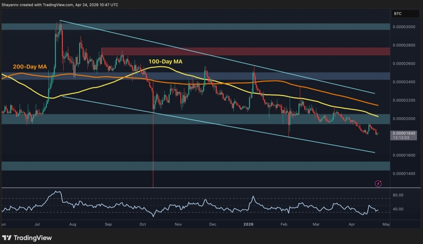 The next key support sits near 1,800 sats, which was the February capitulation low. Below that, the lower trendline boundary around 1,600 sats could become the final possible reversal zone.