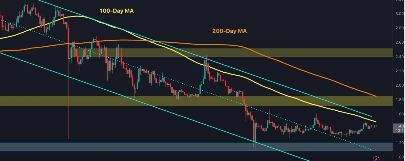The key area remains $1.80, where heavy supply could reshape sentiment if broken. Reaching it would still require more than a 20% rally from current levels, and even then it would remain resistance within the wider bearish structure.