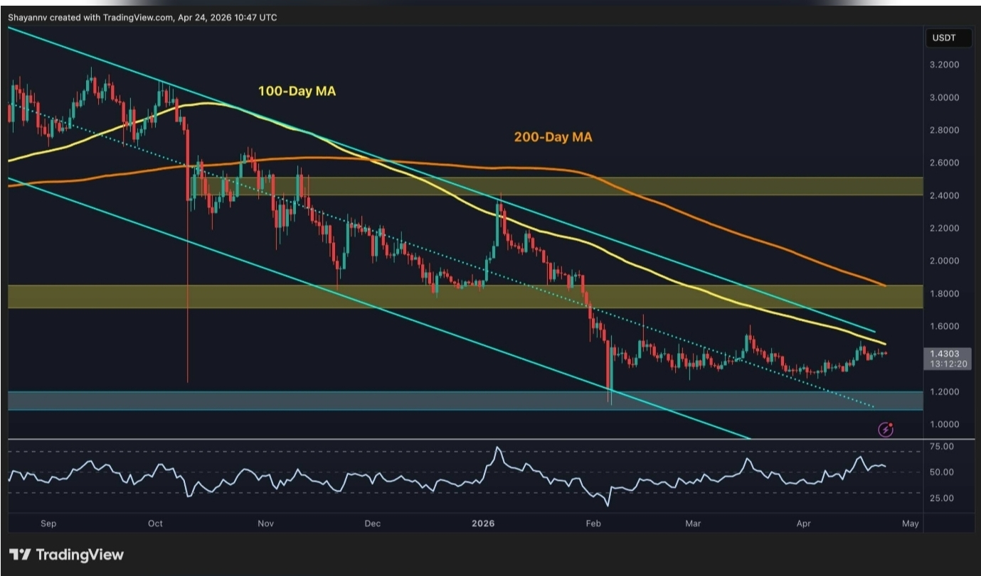 $XRP is still trapped inside the descending channel that has controlled price action since the late-2025 highs, with no confirmed breakout yet. The gap between current levels and major resistance still makes a bullish recovery case hard to justify. The 100-day moving average has slipped to around $1.50, while the 200-day sits near $1.80.