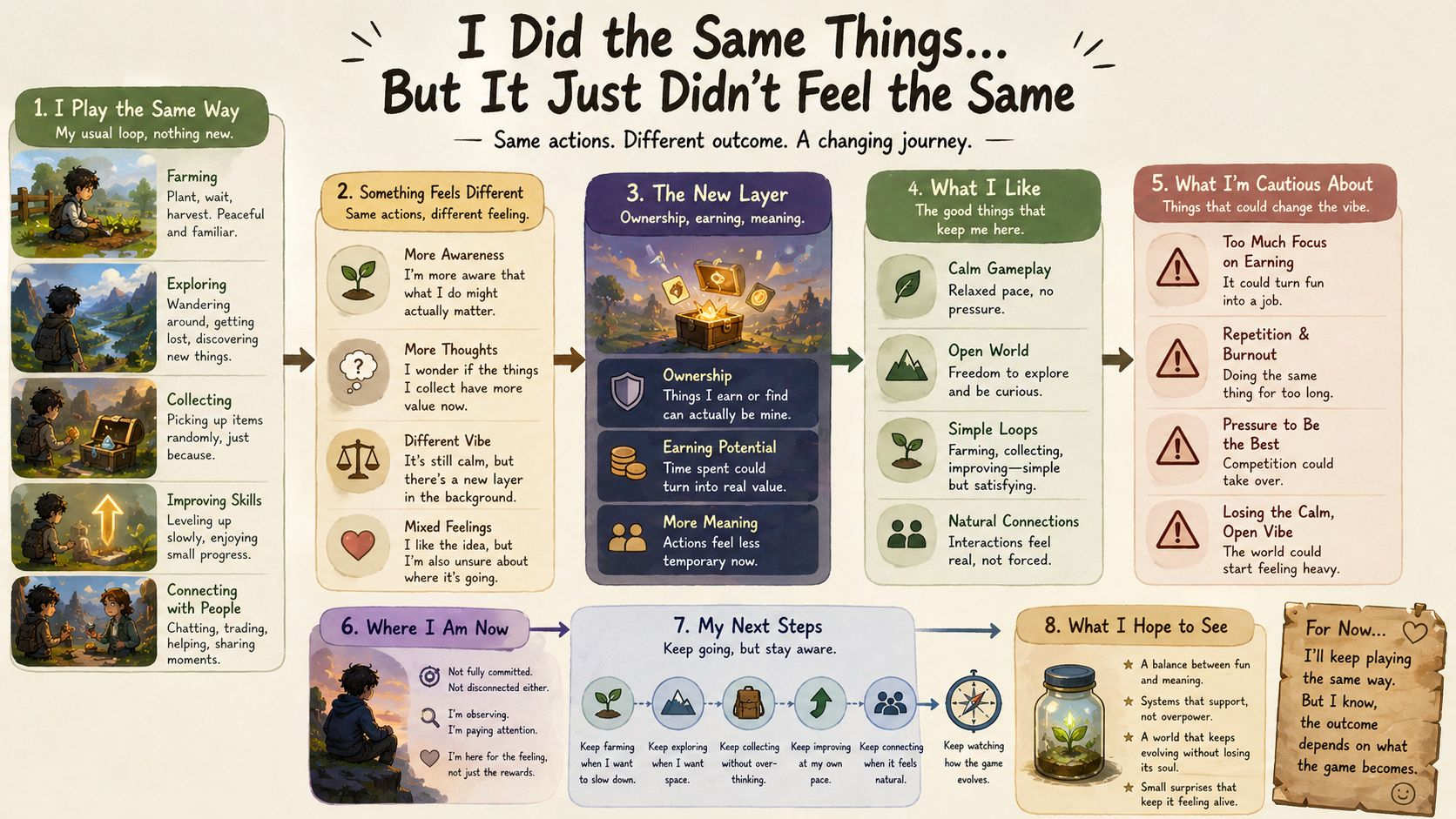 For now, I’ll just keep playing the way I always have. No big strategy. No pressure. I’ll farm when I feel like slowing down, explore when I want space, collect things without thinking too hard about it, and just let things unfold.