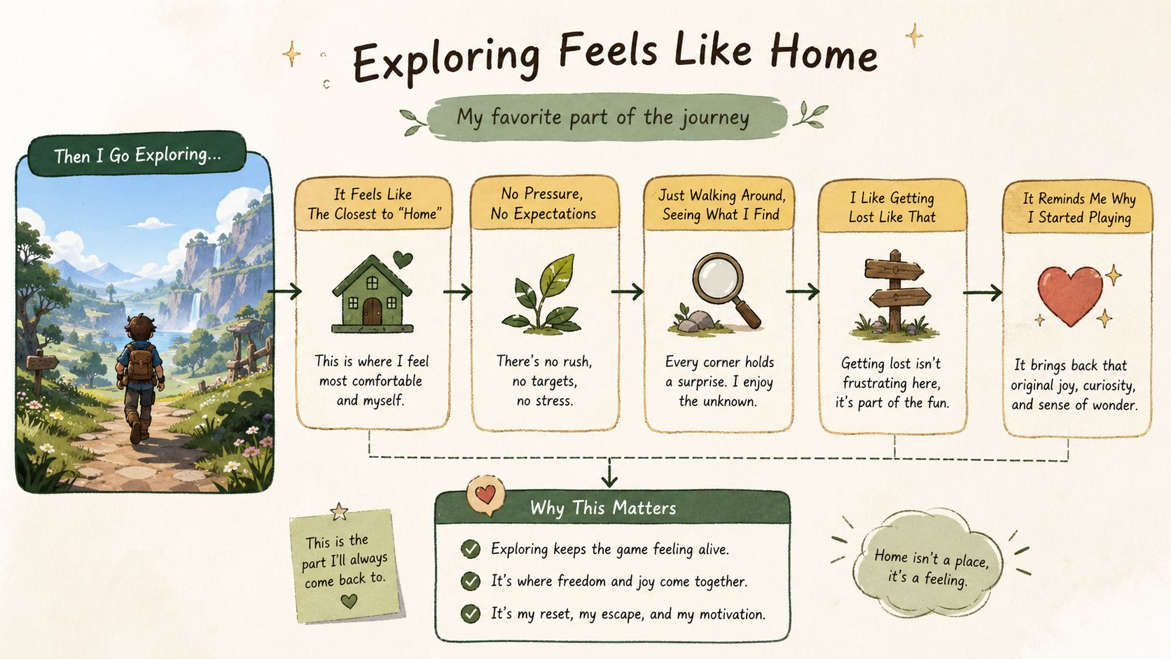 Then I go exploring, and that part still feels the closest to “home.” No pressure, no expectations. Just walking around, seeing what I find. I like getting lost like that. It reminds me why I started playing.