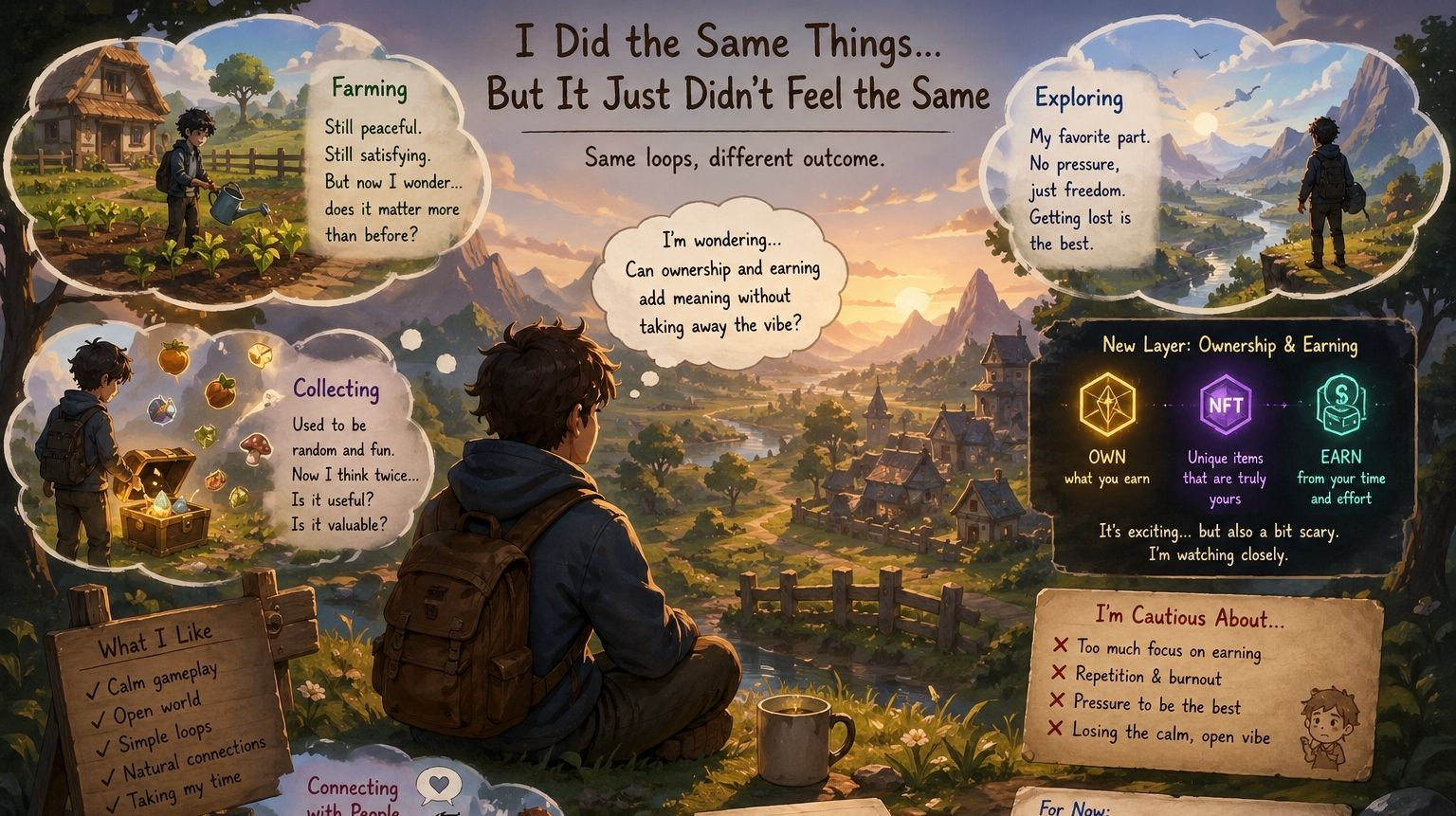 Because I’ve seen what happens when games lean too hard into that “earning” side. Things stop feeling light. Farming turns into grinding. Exploring turns into strategy. Even connecting with people can start to feel… transactional.