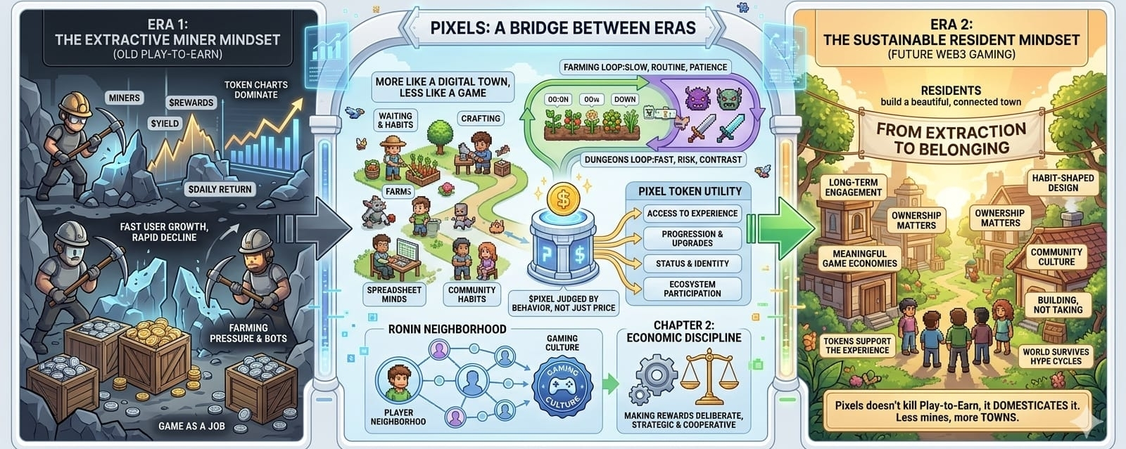 The wild version of play-to-earn was fast, exciting, unstable, and often destructive. Pixels is attempting something calmer: a system where earning is still present, but shaped by participation, patience, and community.