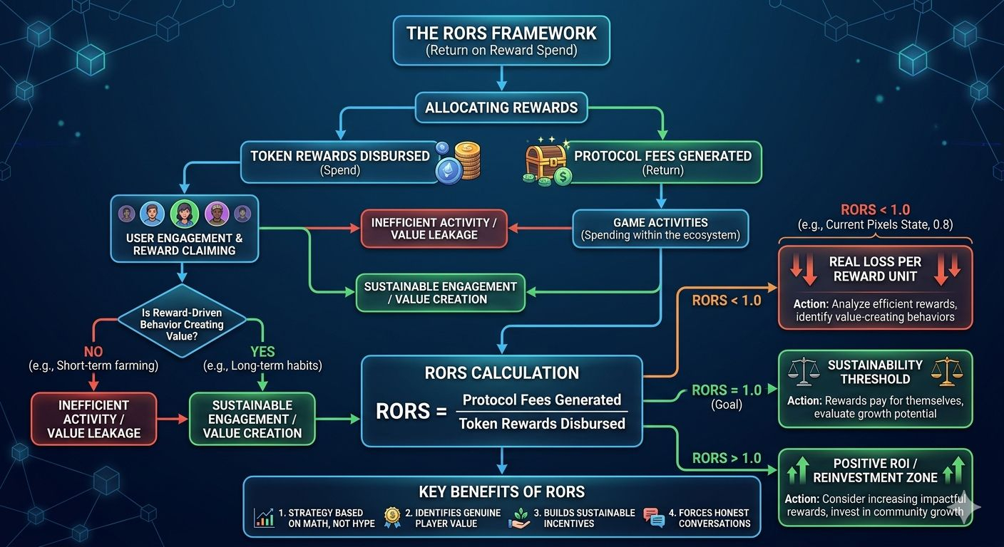 I’ve been turning this over in my head for a bit now—Pixels and their whole RORS thing—and man, it just feels different. Like someone finally decided to stop with the hype slides and actually say what’s really going on with player rewards. It’s not complicated or fancy; that’s what I like about it. RORS is just Return on Reward Spend. Basically, for every token they give out to players, how much money comes back to the protocol through fees? They even liken it to ROAS from regular advertising, which makes total sense. Right now it’s sitting around 0.8, and they’re straight-up aiming to push it past 1.0 so the rewards start paying for themselves instead of just… costing.